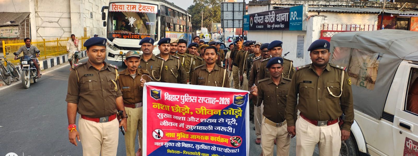 मोतिहारी/प्रतिनिधि/अरबिंद कुमार तिरहुत ब्यूरों(मालंच नई सुबह):-बिहार पुलिस सप्ताह के दूसरे दिन पिपराकोठी थाना के द्वारा सोमवार को नशा मुक्ति के खिलाफ जागरूकता फेरी निकाली। यह फेरी थाना परिसर से शुरू हुई और थानाध्यक्ष ब्रजेश कुमार सिंह के नेतृत्व में पुलिस पदाधिकारियों व जवानों ने क्षेत्र का भ्रमण किया। इस दौरान पुलिसकर्मी “नशा छोड़ो, जीवन जोड़ो” जैसे नारों के साथ लोगों को जागरूक करते हुए आगे बढ़े। उन्होंने लोगों से नशे से दूर रहने और समाज को नशा मुक्त बनाने का संदेश दिया। जागरूकता फेरी मुख्य चौराहे, बाजार और आसपास के इलाकों में घूमी। पुलिसकर्मियों ने लोगों को नशे के दुष्परिणामों की जानकारी दी और युवाओं से विशेष रूप से नशे से दूर रहने की अपील की। उन्होंने बताया कि नशा व्यक्ति के स्वास्थ्य, परिवार और समाज को नकारात्मक रूप से प्रभावित करता है। थानाध्यक्ष ब्रजेश कुमार सिंह ने बताया कि बिहार पुलिस सप्ताह के तहत ऐसे कार्यक्रम आयोजित कर लोगों को जागरूक किया जा रहा है। इसका मुख्य उद्देश्य समाज में नशे के खिलाफ जनचेतना बढ़ाना है। इस फेरी में एसआई मनीष कुमार, धनंजय कुमार, शशिभूषण कुमार, एएसआई राकेश पाल, चौकीदार पंकज कुमार और राजकुमार चौरसिया सहित कई पुलिस पदाधिकारी व जवान शामिल थे।