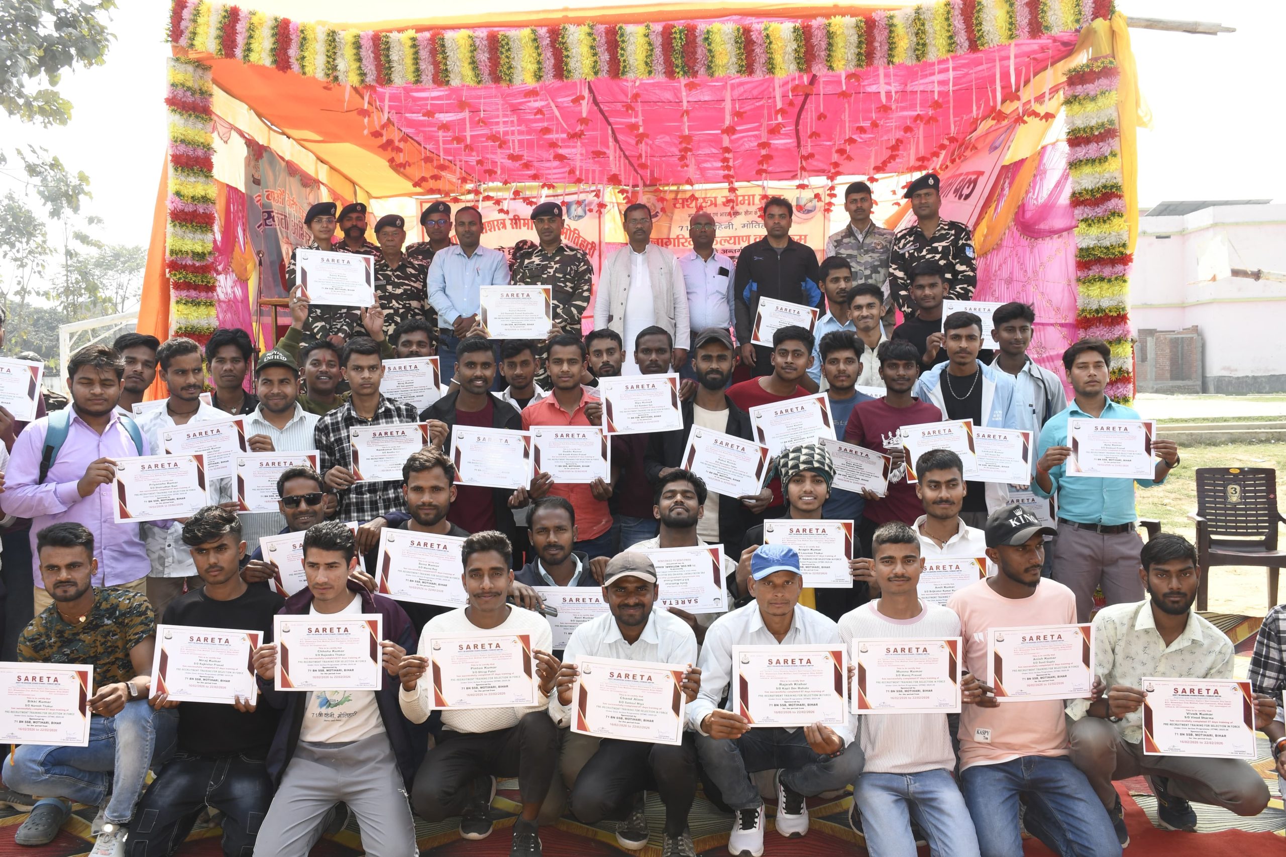 मोतिहारी/प्रतिनिधि/अरबिंद कुमार ब्यूरों चीफ, तिरहुत (मालंच नई सुबह)*मोतिहारी* _71वीं वाहिनी सशस्त्र सीमा बल (एसएसबी) के तत्वावधान में सीमावर्ती क्षेत्र के युवाओं को सशक्त बनाने की दिशा में एक सराहनीय पहल की किया जा रहा है।सीमा चौकी महुअवा के वाइब्रेंट विलेज (VVP-II)महुअवा के सतगुरु कबीर महंथ रामखेलावन गोस्वामी प्रोजेक्ट +2 हाई स्कूल, कटकेनवा में नागरिक कल्याण कार्यक्रम के तहत आयोजित भर्ती-पूर्व प्रशिक्षण कार्यक्रम का समापन समारोह आयोजित किया गया। यह कार्यक्रम 16 से 22 फ़रवरी 2026 तक कमांडेंट प्रफुल्ल कुमार के मार्गदर्शन में संचालित किया गया।समापन समारोह में दिलीप कुमार ,जिला परिषद् ,छौड़ादानो मुख्य अतिथि के रूप में उपस्थित रहे।कार्यक्रम की शुरुआत मुख्य अतिथि द्वारा दीप प्रज्वलित कर किया गया | कार्यक्रम के दौरान सीमावर्ती गांवों के युवाओं और युवतियों को केंद्रीय सशस्त्र पुलिस बलों में भर्ती की संपूर्ण प्रक्रिया से अवगत कराया गया | प्रशिक्षण के दौरान प्रतिभागियों को दस्तावेज सत्यापन,शारीरिक मानक परीक्षण,आयु परीक्षण, शारीरिक दक्षता परीक्षा,लिखित परीक्षा एवं चिकित्सीय परीक्षण से जुड़ी विस्तृत जानकारी दिया गया । इस भर्ती-पूर्व प्रशिक्षण में वाहिनी के कार्यक्षेत्र के सीमावर्ती गांवों विशेष कर वाइब्रेंट विलेज (VVP-II) से आए कुल 200 युवाओं को प्रशिक्षण दिया गया।कार्यक्रम के दौरान 71 वीं वाहिनी स.सी.ब. मोतिहारी के उप कमांडेंट सतीश कुमार गुप्ता , ने सभी प्रशिक्षुओं को बताया कि भारत सरकार के द्वारा समय समय पर सीमा के युवक व युवतियों के कौशल विकास हेतु ऐसे ही निःशुल्क प्रशिक्षण सशस्त्र सीमा बल के माध्यम से दिया जाता है जिससे वो अपने आप को स्वरोजगार से जोड़कर स्वावलंबी बना सकें तथा उन्होंने बताया की प्रशिक्षण के दौरान युवाओं को अनुशासन, निरंतर परिश्रम एवं राष्ट्र सेवा के प्रति प्रेरित किया। उन्होंने कहा कि यह पहल सीमावर्ती क्षेत्रों के युवाओं को सशस्त्र बलों से जोड़ने की दिशा में एक मजबूत कदम है, जिससे न केवल उनमें देशभक्ति की भावना प्रबल होगी, बल्कि रोजगार एवं उज्ज्वल भविष्य के नए द्वार भी खुलेंगे |कार्यक्रम में उपस्थित मुख्य अतिथि श्री दिलीप कुमार ,जिला परिषद् ने बताया कि सशस्त्र सीमा बल के द्वारा कराए जा रहे ऐसे प्रशिक्षणों के माध्यम से सभी ग्रामीणों का कौशल विकास हो रहा है, लोग सीमा पर गलत कार्यो को छोड़कर अपने को अच्छे कार्यो में लगाएं और स्वावलंबी बने और साथ ही ऐसे प्रशिक्षण प्राप्त कर केंद्रीय सशस्त्र पुलिस बलों में भर्ती की संपूर्ण प्रक्रिया से अवगत होकर इसकी तैयारी करे और सशस्त्र पुलिस बलों में भर्ती होकर अपने गांव समाज का नाम रौशन करे |कार्यक्रम में विशिष्ट अतिथि के 